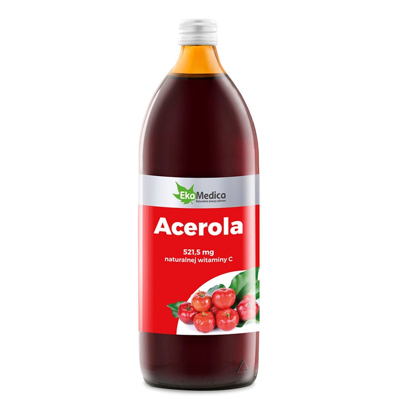 Acerola – Сок от Ацерола е хранителна добавка в течна форма, която съдържа 100% плодов сок от ацерола. Този сок се характеризира с наситен червен цвят и приятен сладко-кисел вкус. Освен отличния си вкус, сокът от ацерола има в състава си високо съдържание на Витамин C. 50 мл. сок от ацерола доставя на организма 521,5 мг. Витамин C, който е отличен антиоксидант и подкрепя функциите на имунната система. Засилва имунната функция на организма и е особено подходящ за хора с понижен имунитет. Освен това сокът от ацерола е богат на множество витамини и минерали като калий, калций, фосфор и витамини от групата B. Той подобрява работата на кръвоносната система и благоприятства усвояването на желязо в организма. Спомага за поддържането на нормалните нива на холестерол и защитава клетките от оксидативен стрес. Тази хранителна добавка не съдържа изкуствени оцветители, подобрители и добавена захар. Препоръчителният дневен прием на сок от ацерола е по 25 мл. два пъти на ден половин час преди хранене.