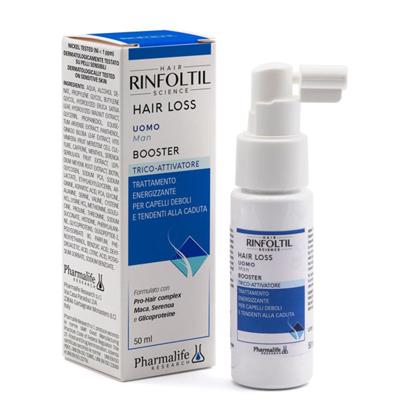 RINFOLTIL Hair Loss Booster Trico-Activator на италианската марка Pharmalife Research е козметичен продукт в подкрепа стимулирането на растежа на здрава коса. Продуктът е обогатен с екстракт от рукола и орех, които доставят ценни фитонутриенти за подхранване на скалпа и подобряване на микроциркулацията. Полският хвощ е естествен източник на силиций – важен елемент за здравината и еластичността на косъма. Гинко билоба и гроздови екстракти действат като мощни антиоксиданти, които предпазват клетките от оксидативен стрес и стареене, докато кофеинът стимулира кръвообращението и активира космените фоликули. Палма-джудже (Serenoa serrulata) е добре позната съставка при продукти срещу косопад, тъй като подпомага регулирането на действието на DHT – хормон, свързан с оплешивяването при мъже.