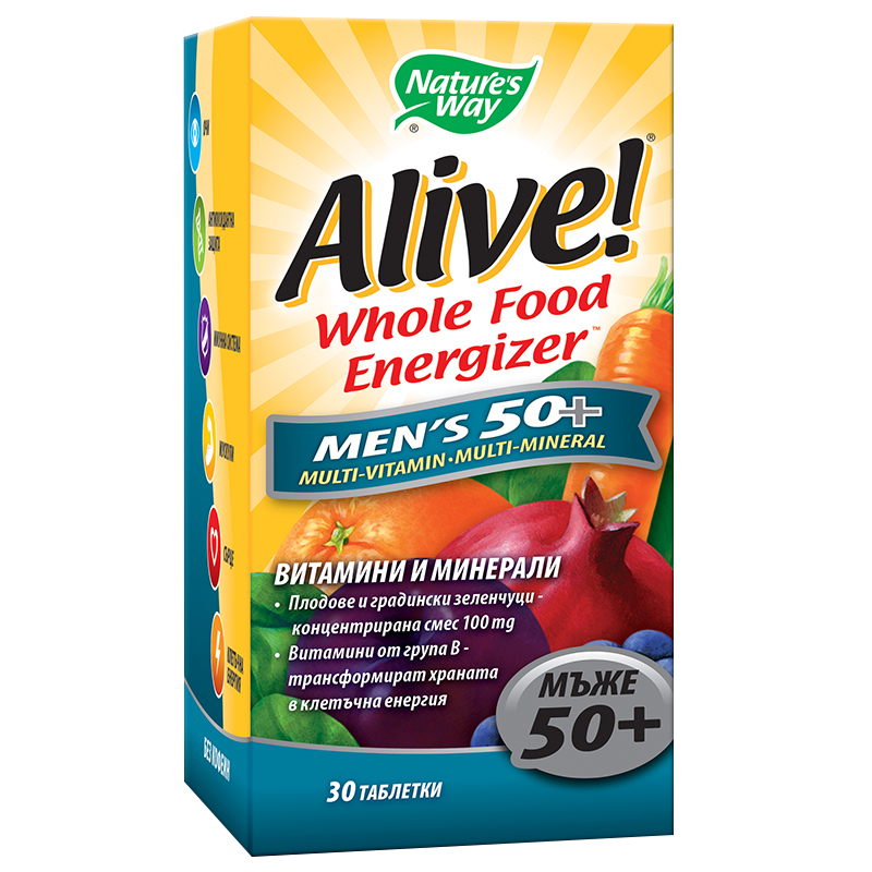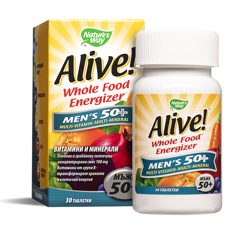 Aлайв! Mултивитамини за мъже 50+ е висококачествена формула, източник на витамини, минерали, антиоксиданти, плодови и зеленчукови екстракти в подкрепа на мъжкото здраве след 50 годишна възраст. Осигурява всичко необходимо за нормалното функциониране на мъжкия организъм.