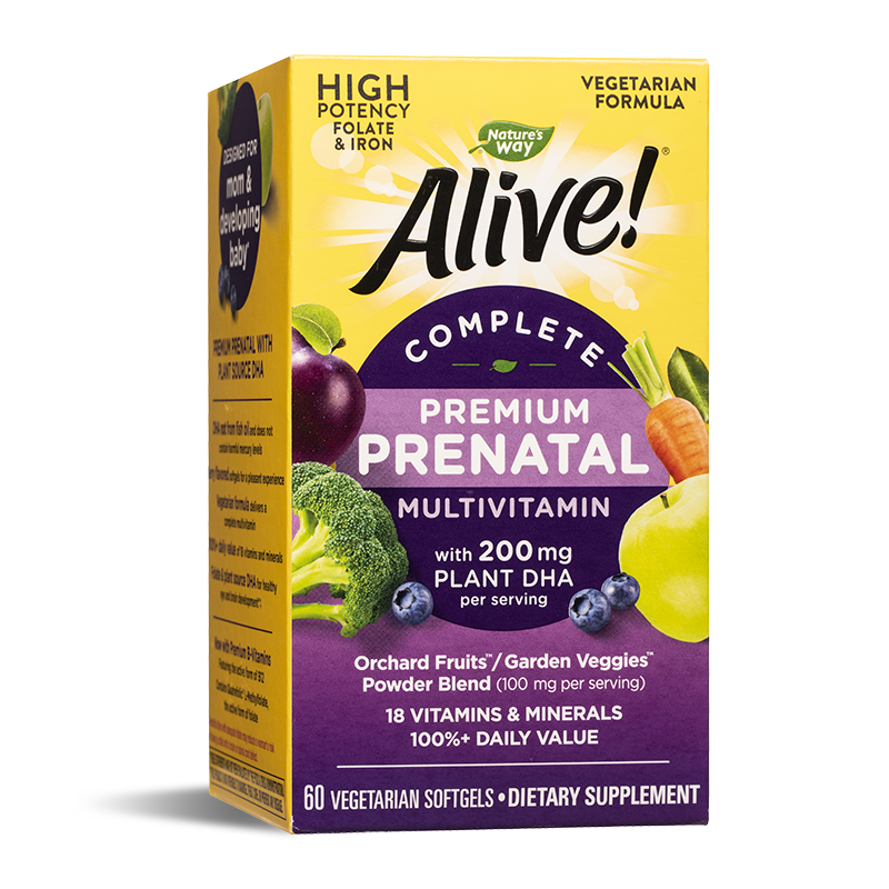 Alive! Complete Premium Prenatal Multivitamin – мултивитаминна формула за бременни и кърмещи жени с растителна DHA.