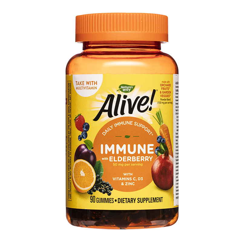Alive! Immune Gummies / Алайв! Имунна защита е част от голямата серия Алайв! мултивитамини на реномирания американски производител Nature’s Way. Продуктът съдържа балансирана комбинация витамини: А, С, D, Е, минерала цинк, екстракт от черен бъз, както и патентована смес овощни плодове и градински зеленчуци Orchard Fruits™ Garden Veggies™ (акай бери, ананас, банан, боровинка, грозде, круша, малина, нар, портокал, череша, ябълка, ягода, тиква, аспержи, броколи, брюкселско зеле, грах, домат, зеле, карфиол, краставица, морков, спанак).