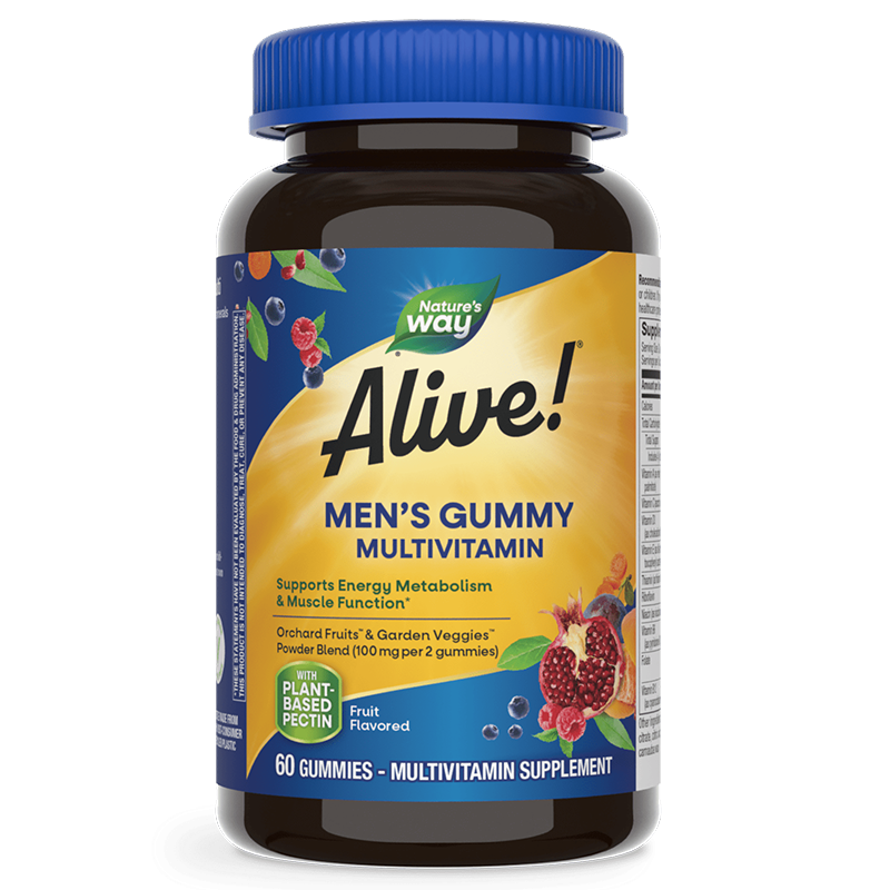 Alive! Men’s Gummy Complete Multivitamin е висококачествена мултивитаминна формула, специално създадена за мъже. 1 желирана таблетка Alive! Men’s Gummy Complete Multivitamin съдържа 15 основни витамини и минерали в комбинация с патентована смес плодови и зеленчукови екстракти, и ликопен.