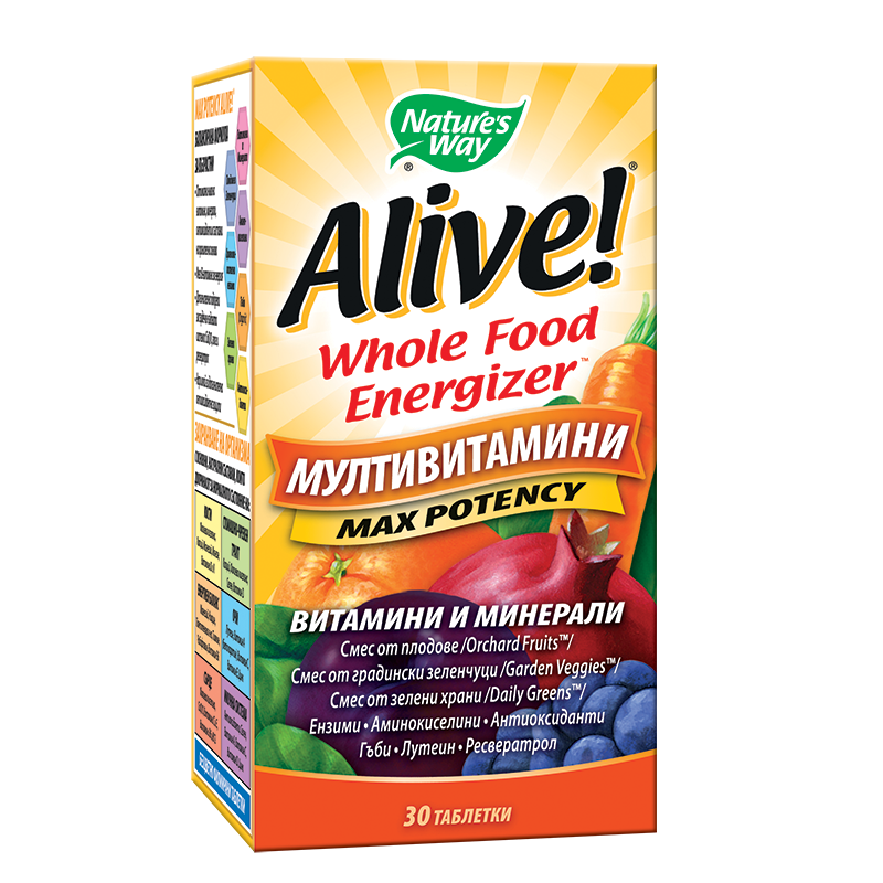 Alive! Мултивитамини не е просто смес от витамини и минерали, а суперхрана събрана в една таблетка. В нейния уникален състав присъстват витамини, минерали, антиоксиданти суперхрани и др. В Алайв ще откриете екстракти от богатите на хлорофил зеленолистни зеленчуци, пълните с антиоксиданти боровинки и къпини, уникалните по състав и съдържание на протеин водорасли. Специалната смес от китайски гъби в продукта е извор на младост и дълголетие. А за да бъде всичко това добре усвоено, Алайв! Мултивитамини са обогатени с естествени храносмилателни ензими!