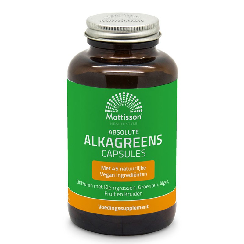Absolute Alkagreens Caps Mattisson е веган формула, без съдържание на глутен и лактоза. Продуктът противодейства на подкиселяването на организма, под влиянието на различни фактори като стрес, тютюнопушене, тежко физическо натоварване, прием на лекарства и някои храни (захар, газирани напитки, алкохол и кафе). Той включва в състава си повече от 45 внимателно подбрани натурални съставки, предимно с органичен произход: