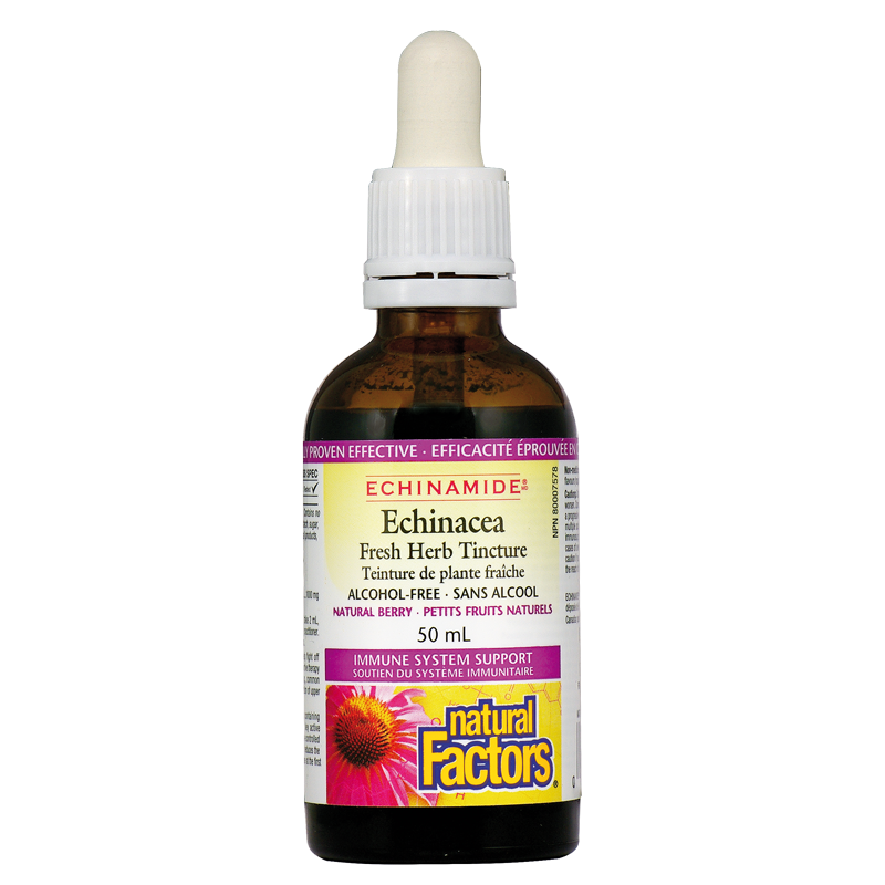 Екстрактът в тинктурата на Natural Factors, е патентован като Echinamide® и е извлечен в периода, в който биоактивните съединения на Echinacea purpurea бележат пикови концентрации. Тъй като предоставя оптималния набор терапевтични вещества, Echinamide® се отличава с изключително мощно имуностимулиращо, противопростудно и противогрипно действие.