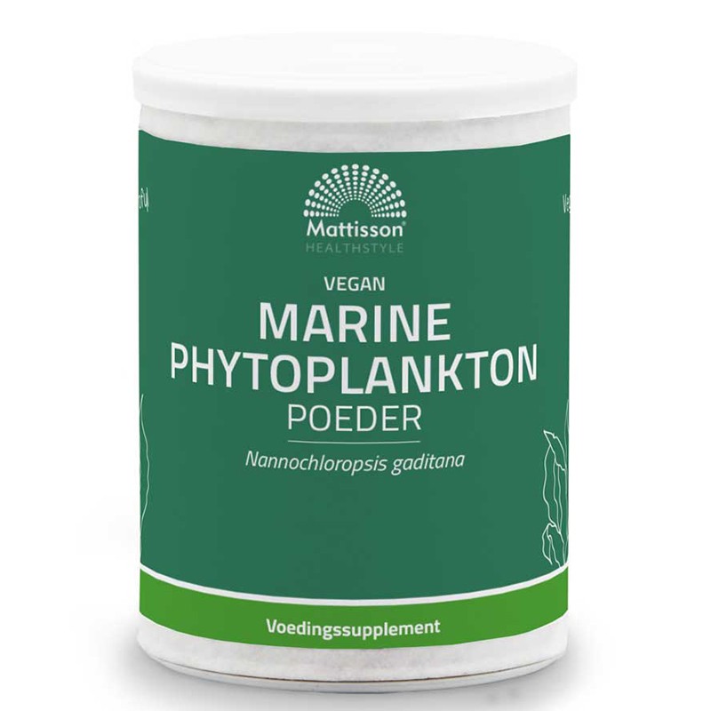 Този фитопланктон на прах е много богат на витамин B12, който допринася за засилване на имунитета, за нормалното функциониране на нервната система и добър енергиен метаболизъм. Прахът от морски фитопланктон съдържа голямо количество йод – микроелемент, важен за производството на хормони на щитовидната жлеза. Тези хормони са необходими за развитието на нервната система и метаболизма. Морският фитопланктон е микроскопично водорасло, което е в основата на хранителната верига. От преди милиарди години всички живи същества, както в океана, така и на сушата, са пряко зависими от фитопланктона. Морският фитопланктон осигурява около 70% от целия кислород на земята. Фитопланктонът е храната, от която рибите черпят високото си съдържание на Омега-3. Морският фитопланктон (Nannochloropsis gatiana) на Mattisson се отглежда на брега на Oostvaardersplassen в Холандия с морска вода на 100 000 години. Подлага се на строги тестове за качество и безопасност, за да се гарантира, че е 100% чист. Съдържа мазнини, въглехидрати, захари, протеини, фибри и сол. Продуктът е подходящ за вегани.