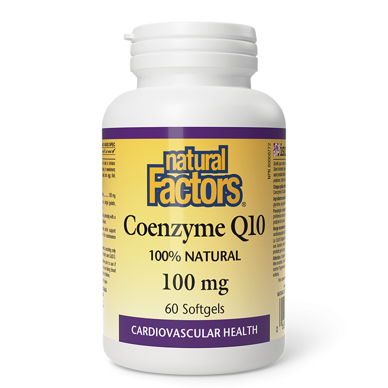 Natural Factors  Коензим Q10 100 mg доставя 100 mg убиквинон (микроорганизми) в дневна доза. Убиквинон, произведен чрез ферментация от микроорганизми, е по-близък до ендогенната форма.