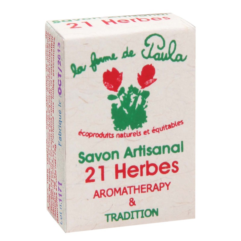 Аюрведичен сапун с 21 билки е козметичен продукт на растителна основа, който съдържа в състава си естествени масла (кокосово, палмово, рициново и сусамово масла), както и 21 билкови ароматни есенции – масла от роза дамасцена, пачули, иланг-иланг, сандалово дърво, карамфил, нийм, босилек и др. Деликатно почиства кожата на лицето или тялото и в същото време не я пресушава, а я оставя мека и добре хидратирана. Този козметичен сапун има свеж и нежен аромат и притежава антисептични, противовъзпалителни и антибактериални свойства. Действа благоприятно при кожни раздразнения, акне, дерматит, екзема и спомага за регенериране на кожата.