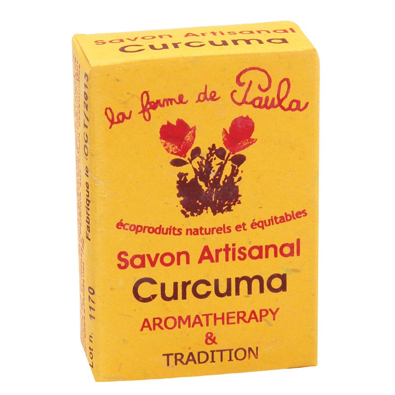 Аюрведичен сапун с Куркума е козметичен продукт на растителна основа, който съдържа в състава си естествени масла (кокосово, палмово, рициново и сусамово масла), както и ароматни аюрведични есенции – етерични масла от куркума, портокал, нийм и карамфил. Сапунът има деликатен и нежен аромат, а освен това почиства добре кожата както на лицето, така и и на тялото, без да я изсушава. Куркумата в този продукт притежава антиоксидантни свойства, помага за намаляване на тъмните петна и хиперпигментацията и оказва положителен ефект при раздразнена кожа и акне. Маслото от нийм в този козметичен продукт също притежава противовъзпалителни свойства и помага при раздразнения, пъпки и други кожни проблеми.