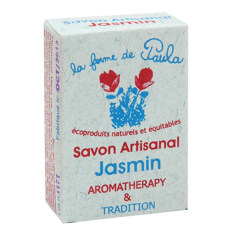 La Ferme de Paula Savon Artisanal Jasmin – Аюрведичен сапун с Жасмин е козметичен продукт на растителна основа, който съдържа в състава си естествени масла (кокосово, палмово, рициново и сусамово масла), както и ароматни аюрведични есенции – етерични масла от жасмин и лавандула. Този продукт едновременно деликатно почиства кожата и в същото време я оставя добре хидратирана и мека на допир. Сапунът има приятен деликатен аромат и е подходящ за всички типове кожа. Екстрактът от жасмин допринася за регенерацията на кожата и спомага за по-бързото зарастване на рани и кожни раздразнения. Лавандулата в състава на този сапун действа релаксиращо и отпускащо, а освен това има антибактериално, противогъбично и противовъзпалително действие.