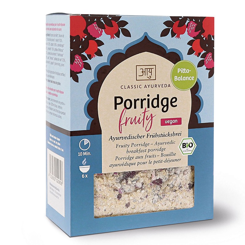 Съдържа мюсли, оризови люспи, корнфлейкс, горски плодове, черница, фурми, червена боровинка, нар, малина, цвят от хибискус, розов цвят и подправките кориандър, копър, анасон, кардамон, пипали (дълъг пипер) и черен пипер. Според Аюрведа сутрешната закуска трябва да е топла и лека, за да дава жизненост и добър старт на деня. Сладките плодове и източните подправки са фино балансирани за нуждите на динамичния тип доша Пита и осигуряват хармония през целия ден. Кашата е подходяща за вегани. Приготвя се само за няколко минути и може да се гарнира със сироп от агаве или клен.