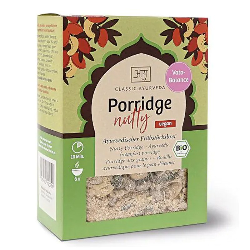 Зърнената закуска Porridge nutty Vata-Balance е идеалното топло ястие за един наистина приятен старт на новия ден. Зад превъзходния вкус на сушени плодове и подправки се крият и множество полезни за здравето качества, държащи се на трите основни компонента в нейния състав.