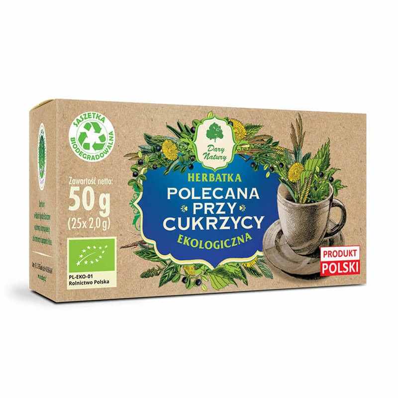Polecana Przy Cukrzycy EKO – Билков Чай при Диабет, БИО е чай под формата на филтрирани пакетчета, смес от няколко билки от контролирано био земеделие, който спомага за регулиране нивата на кръвната захар. Съдържа в състава си листа от черна боровинка, листа от глухарче, цвят от безсмъртниче, листа от маточина, листа от бреза и корен цикория. Листата на черната боровинка спомагат за регулиране на кръвната захар и насърчават нормалния глюкозен метаболизъм. Листата от глухарче също помагат за поддържането на оптимални нива на кръвната захар в кръвта, а освен това и подобряват храносмилането и стимулират обмяната на веществата. Този билков чай се препоръчва при диабетни и преддиабетни състояния.