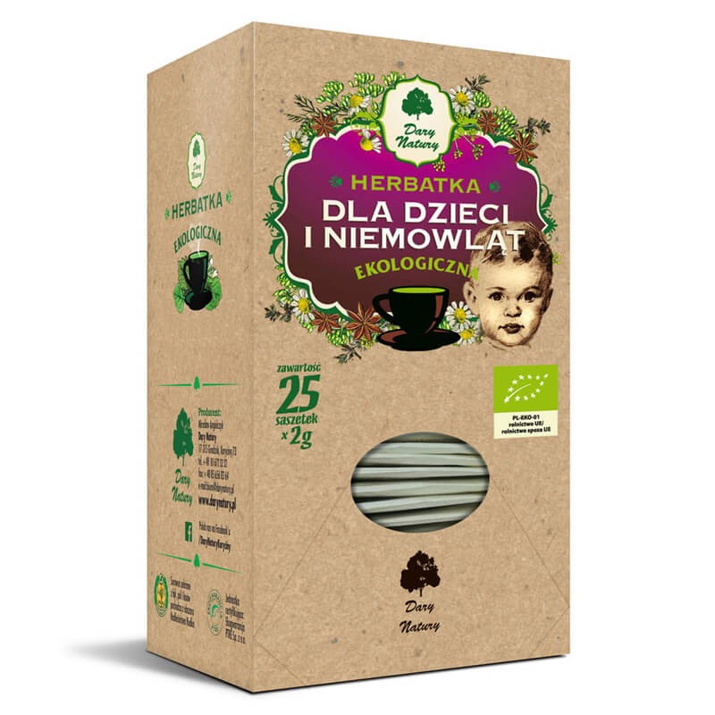 Herbatka dla dzieci i niemowląt eko представлява смес от органични, висококачествени билки, съставени на базата на традиционни билкови рецепти. Произведен е от билки, отгледани по биологичен начин
