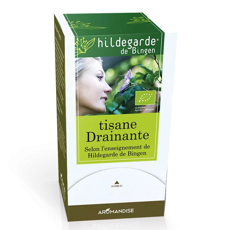 Tisane drainante Hildegarde – Билков диуретичен чай Хилдегарде е билкова смес, която съдържа маточина, листа от къпина, анасон, исоп, листа от леска, коприва и ягода и листенца от метличина