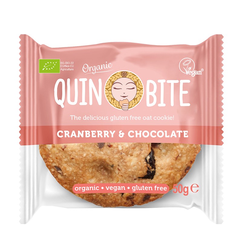 Quin bite Cranberry Chocolate е веган, безглутенова курабийка, на която просто не може да се устои. Направена е от 100% натурални органик съставки и е изключително хрупкава, вкусна и здравословна