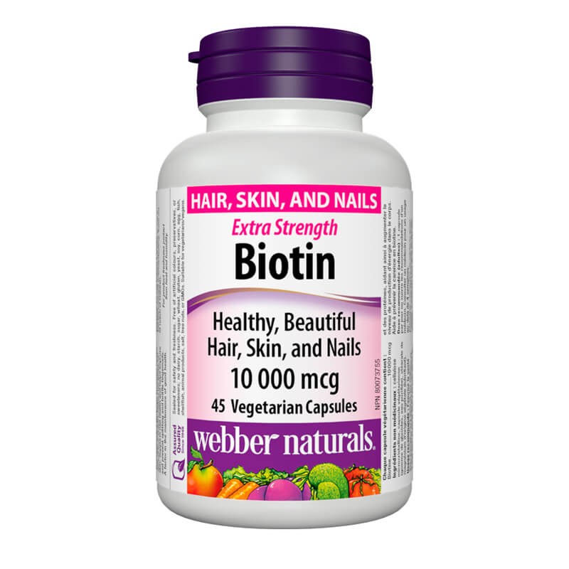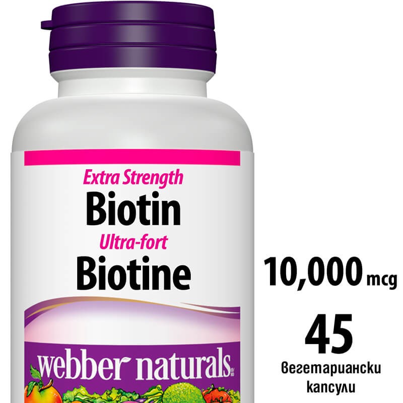 1 капсула от биотиновата добавка на канадската компания Webber Naturals осигурява 10 000 mcg оптимално усвоим биотин. Продуктът НЕ съдържа глутен, ГМО, изкуствени подсладители и оцветители, консерванти. Предлага се под формата на лесни за прием вегетариански капсули.