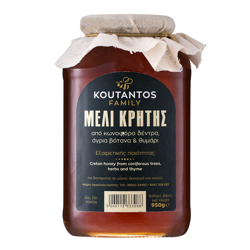 „Критски мед от иглолистни дървета, билки и мащерка“ е едно от най-добрите антисептични, противовъзпалителни и природни естествени средства, които природата ни дава. Той е с по-тъмен цвят, има специален дървесно-цветен аромат и богата текстура. Притежава „средна“ сладост, а кристализацията се извършва с бавно темпо. Особено богат е на микроелементи и ценни хранителни вещества, които се дължат на уникалната комбинация от медна роса, нектар от мащерка и диви критски билки като градински чай, риган, дитания, мента. Всички те събрали слънцето и изключително силната енергия на този приказен средиземноморски остров. Медът е с отлично качество, гарантирано от семейство Коутантос, които от поколения се грижат за стотици кошери, отнасяйки се с любов и уважение към уникалното природно богатство на остров Крит.
