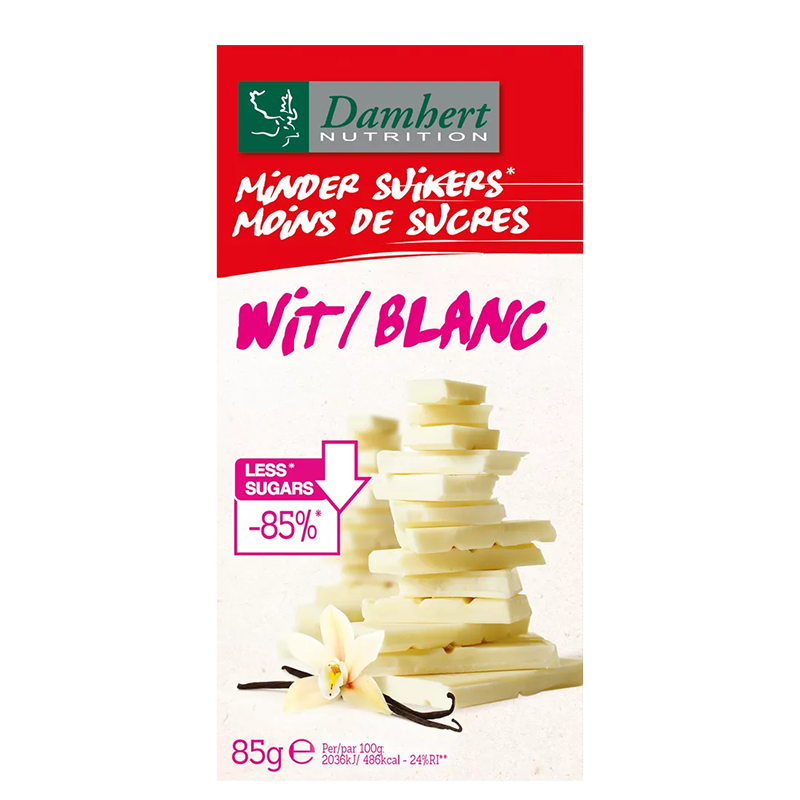 Копринено гладката текстура на Белия шоколад Damhert го превръща в неустоимо сладко изкушение,  но без захар и с по-ниско съдържание на калории от обикновения шоколад. Съставът му включва минимум 31% какаово масло. Прави се с естествен заместители на захарта  – малтитол, който  има около 80% до 90% от сладостта на захарта, но съдържа половината калории. Освен това може да осигури ползи за оралното здраве.