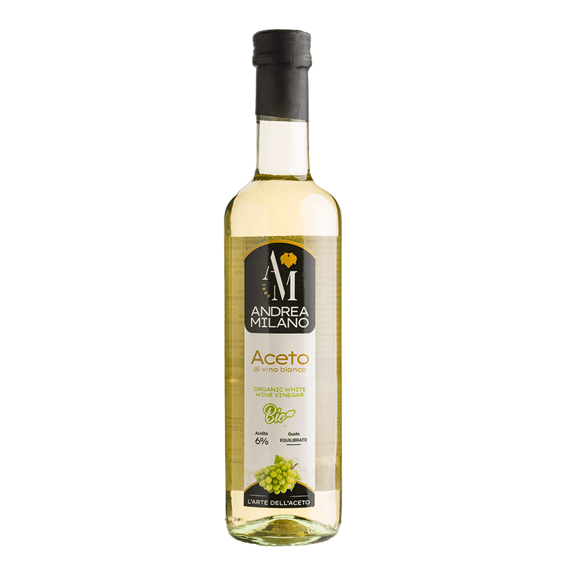 - Белият винен оцет от Andrea Milano е органичен оцет със силна, фино кисела нотка на бяло вино, направено и отлежало от висококачествено италианско бяло вино;