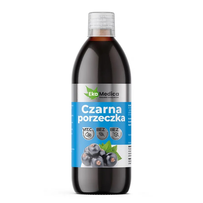 EkaMedica сок от касис 0.5л е хранителна добавка в течна форма, която осигурява витамин C и помага за поддържане синтеза на колаген, здравето на кръвоносните съдове и подкрепя имунитета на организма.