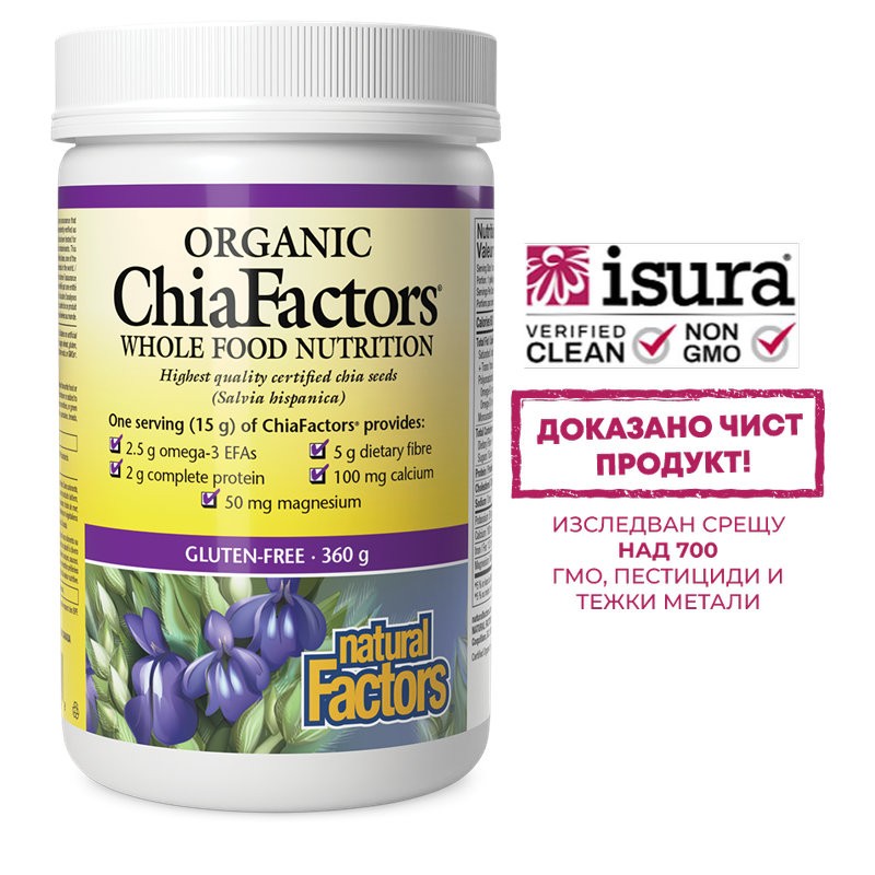Natural Factors Чия Organic ChiaFactors® предоставя висококачествени, сертифицирани, органични семена от чиа /Salvia hispanica/. Една доза съдържа 2,5 г омега-3 полиненаситени мастни киселини, 2 г растителен протеин и 5 г диетични фибри, както и 100 мг калций, 1,25 мг желязо и 50 мг магнезий. Продуктът е подходящ за вегани и хора с чувствителност към глутен.