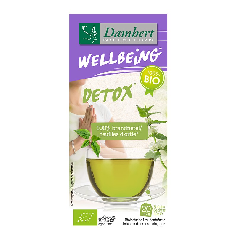 Детокс формулата Wellbeing Tea Detox Nettle BIO на Damhert Nutrition се основата на 100% листа от коприва от контролирано био земеделие. Здравословен избор за детокс на организма и зареждане с жизнена енергия!