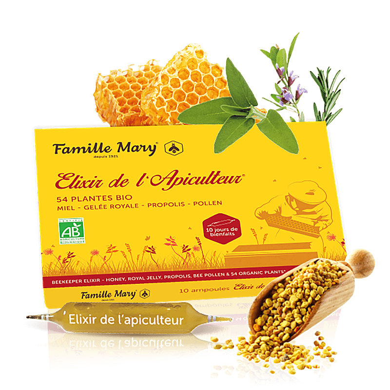 Ампулите Elixir de l’Apiculteur® ще ви помогнат да възстановите цялата си жизнена сила, защото са коктейл от супер съставки с ефекта на енергийна бомба. Те са онова мечтано средство за бърз и незабавен ефект, което буквално ви вдига на крака, независимо дали става дума за повишаване на тонуса, работоспособността, общото усещане за благополучие или искате да изградите мощна бариера срещу вируси и настинки, да се предпазите от често боледуване. Elixir de l’Apiculteur® се препоръчва на възрастни и деца над 12 години, на здрави хора с профилактичен ефект, боледуващи или възстановяващи се след прекарани заболявания. Продуктът действа единствено чрез силата на природата по патентована формула, вдъхновена от пчеларя Жан Мери, създател и идеен вдъхновител на семейната компания – медоносна къща Famille Mary®.