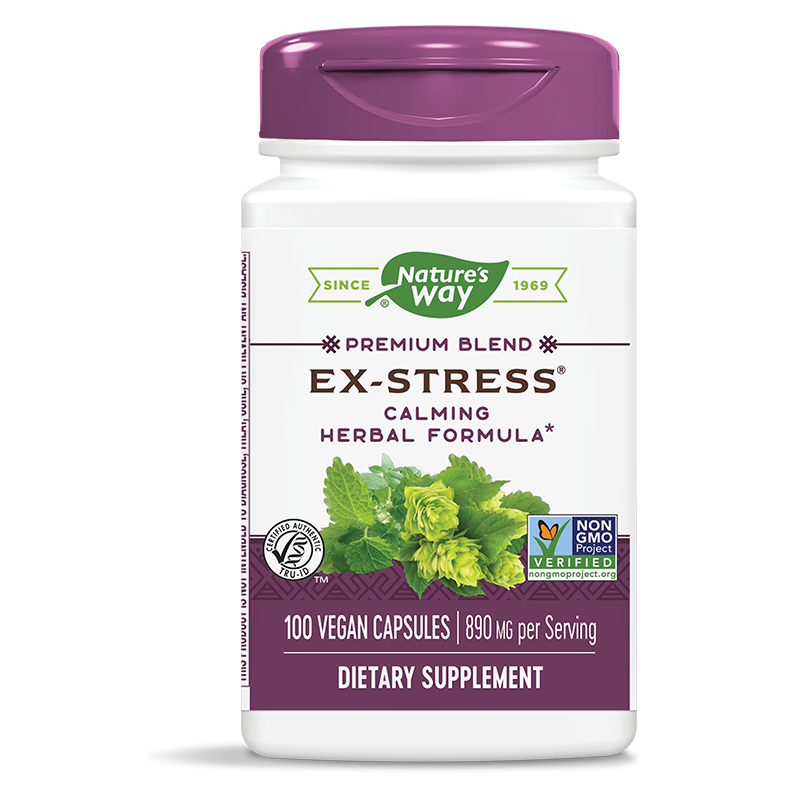 Ex-Stress® е източник на патентована бленда екстракти от маточина (листа), ранилист (стръкове), гроздовиден ресник (корени), хмел (шишарки), валериана (корени) и лютив пипер (плодове) – 100% натурална комбинация, която не съдържа синтетични субстанции и не води до привикване и зависимост. Подходяща е за продължителен прием.