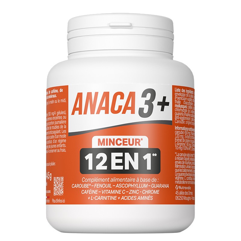 Анака3+ Формула за оптимално телесно тегло 12 в 1 е хранителна добавка, съдържаща в състава си 12 компонента – растителен екстракт от гуарана, рожков, копър, аскофилум, кофеин, хром, витамин C, л-карнитин и микс от аминокиселини