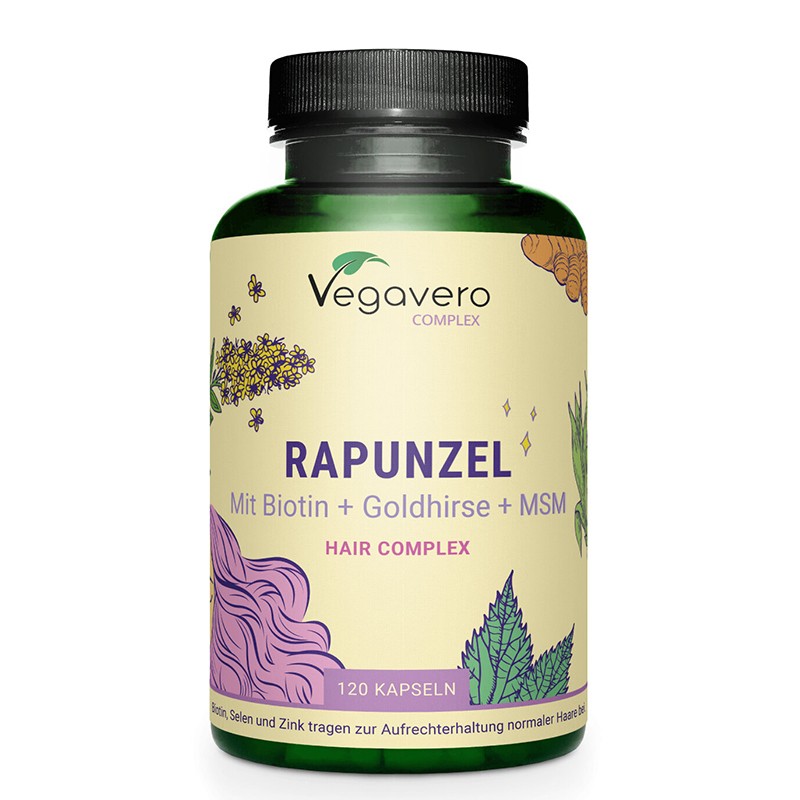 В основата на комплекса са МСМ и двете аминокиселини L-цистеин и L-метионин. И трите съединения съдържат сяра и, наред с другите здравословни ефекти, поддържат състоянието на най-важния структурен протеин в косата – кератина. Тъй като увредената коса и косопадът често се свързват с дефицит на определени хранителни вещества, този продукт на Vegavero доставя на организма биотин, цинк и селен, които са от решаващо значение за поддържането на здравето на косъма. Витамин B2 и фолиевата киселина допълват перфектно действието на желязото и силиция за оптимално подхранване на скалпа и косата. Не на последно място е и ролята на растителната сила във формулата за поддържане на коса. Капсулите Vegavero Rapunzel съдържат златно просо и бамбук, като източник на естествен силиций, както и екстракти от коприва и куркума. Тези растения осигуряват допълнителни ценни вторични растителни вещества като бета-ситостероли и куркуминоиди (куркумин). Редовният прием на биокомплекса спомага за поддържането на здрава и блестяща коса. Рецептата е без ГМО и синтетични добавки, като магнезиев стеарат.