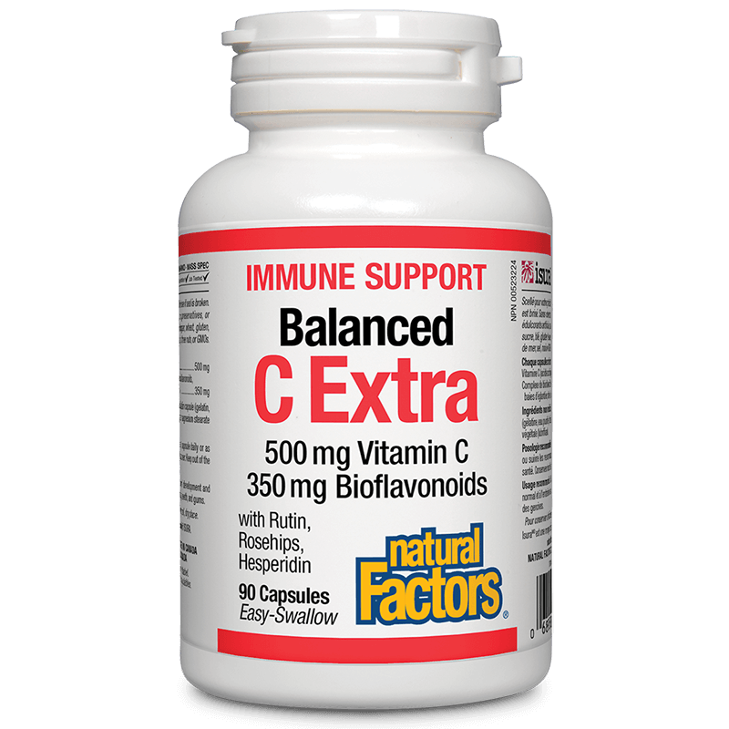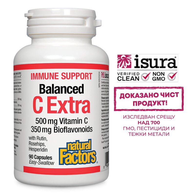 Продуктът Immune Support Balanced C Extra на канадската компания Natural Factors е високодозиран източник на витамин С и цитрусови биофлавоноиди. НЕ съдържа консерванти, подсладители, глутен или ГМО.