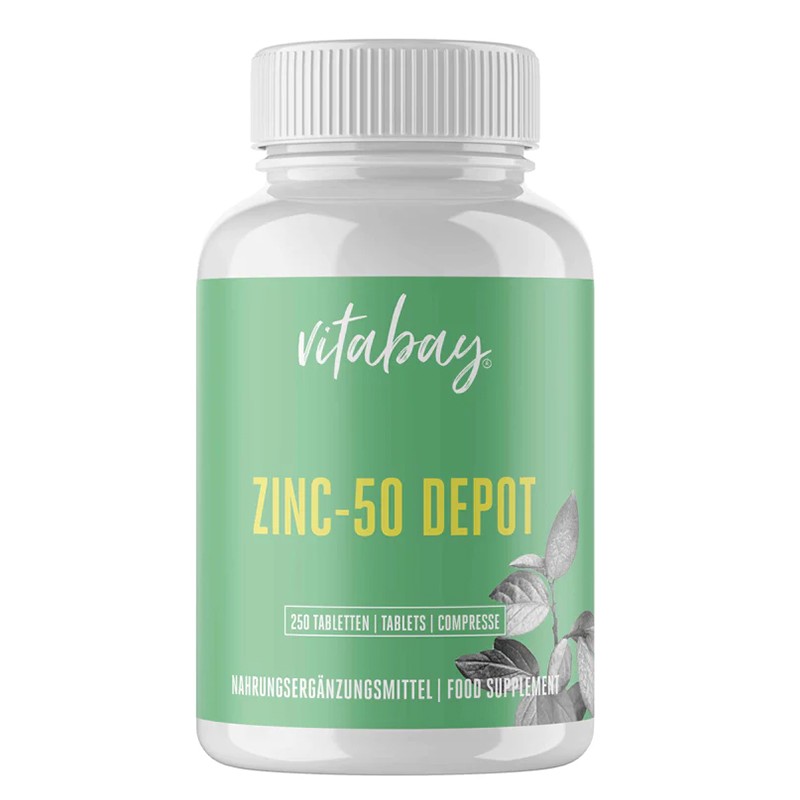 Zinc-50 Depot Цинк (глюконат) 250 таблетки е хранителна добавка на немската компания за здравословни продукти за цялото семейство Vitabay. В продукта няма следи от ГМО, лактоза и глутен.