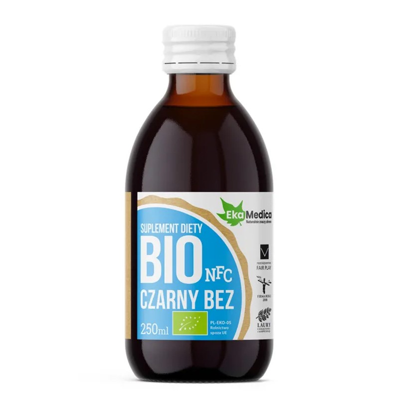 Czarny Bez NFC/ Сок от черен бъз от EKAMEDICA е био продукт, произведен от 100% сок, извлечен от плодовете на черния бъз, без добавена захар. Той е обогатен с още няколко важни съставки: каму каму и витамин C, като допринася за поддържане на нормалното състояние на имунната система, помага за контрол на теглото, повишава абсорбцията на желязо