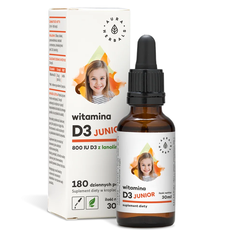 Witamina D3 Junior Aura Herbals е натурален продукт под формата на капки, създаден в подкрепа на детското здраве
