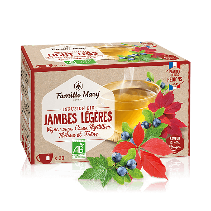 Френската компания Famille Mary® предлага отлично решение, което ще ви помогне да си възвърнете лекотата на движение и ще подобри оросяването в крайниците ви. Infusion bio jambes legeres е чай в подкрепа на венозната система и съдържа червена лоза, листа от касис, боровинка, маточина и прах от листа на планински ясен. Всички съставки в него са продукт на екологично био земеделие и таргетирано действат венотонично (повишават венозния тонус) и вазопротекторно (повишават здравината и еластичността на капилярите).