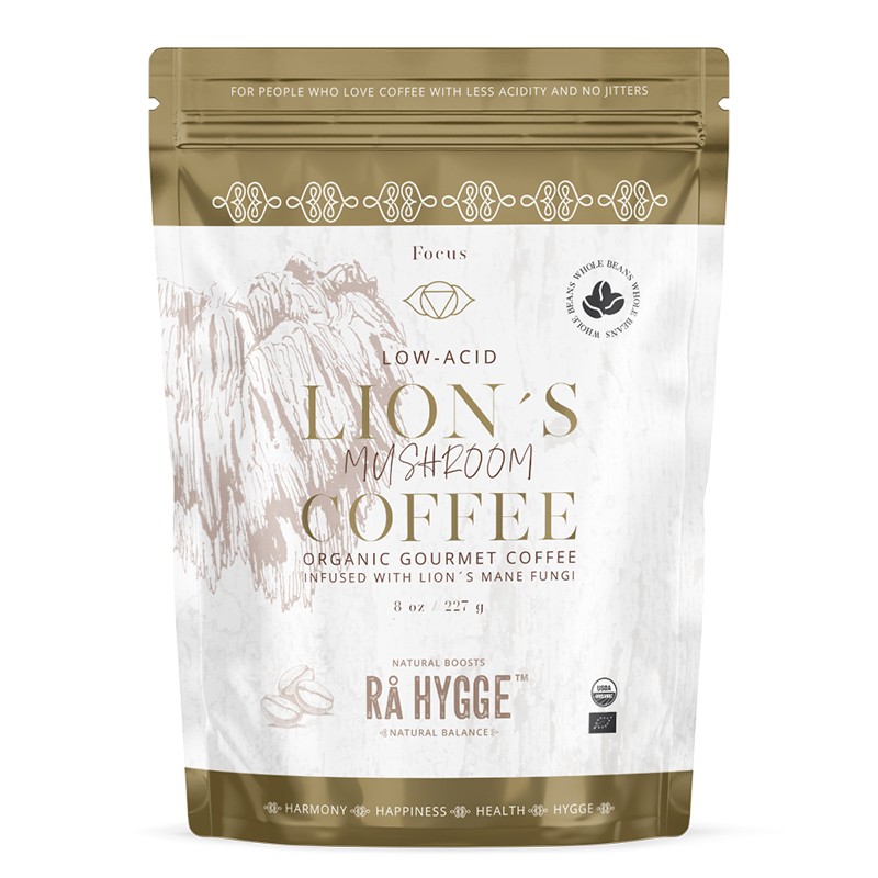Вкусното органично нискокиселинно кафе с функционален екстракт от гъби е уникално творение на RåHygge, което помага за получаване на енергия, но без нервността, свързана с действието на кофеина. Почитана в много древни култури и използвана за лечебни цели от хиляди години, мощната гъба Лъвска грива благоприятства човешкото здраве в много отношения. Тя повишава тонуса и балансира ефекта на кофеина. Лъвската грива е адаптоген и засилва естествените защитни механизми на тялото срещу стреса на ежедневието. Адаптогените работят в синергия с нормалните телесни процеси без сериозни странични ефекти.
