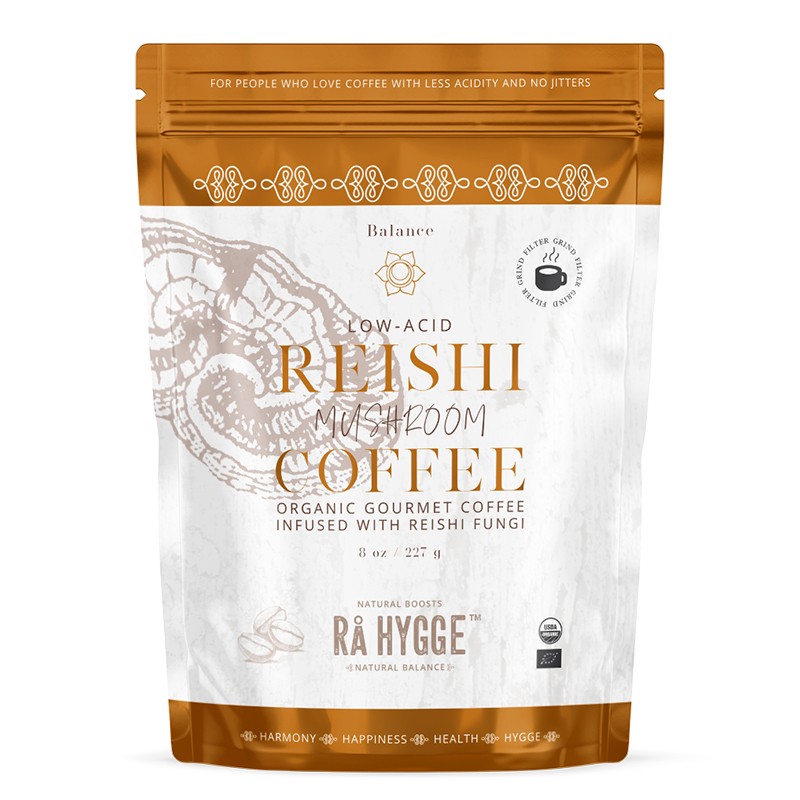 В тази комбинация на Rå Hygge са използвани кафеени зърна от малки БИО ферми в Перу и двойно извлечен екстракт от адаптогенната гъба Рейши. Благодарение на патентованата технология за покриване на зърната след изпичането им с гъбен екстракт и използването на алкална вода, полученото кафе е с по-ниска киселинност от обичайното. Така то не дразни стомаха и добива все по-голяма популярност сред хора с проблеми на храносмилателната система. Кафето е средно изпечено в занаятчийска пекарна в Южна Швеция. Крайният продукт е подходящ за филтърно или еспресо кафе. Като адаптоген, гъбата Рейши взаимодейства с нормалните процеси в тялото и балансира страничните ефекти на кофеина. Кафето Арабика с Рейши тонизира и дава добър старт на деня, но без да предизвиква нервна превъзбуда. Благодарение на добавения гъбен екстракт, напитката има фин земен аромат и интересен вкусов профил.