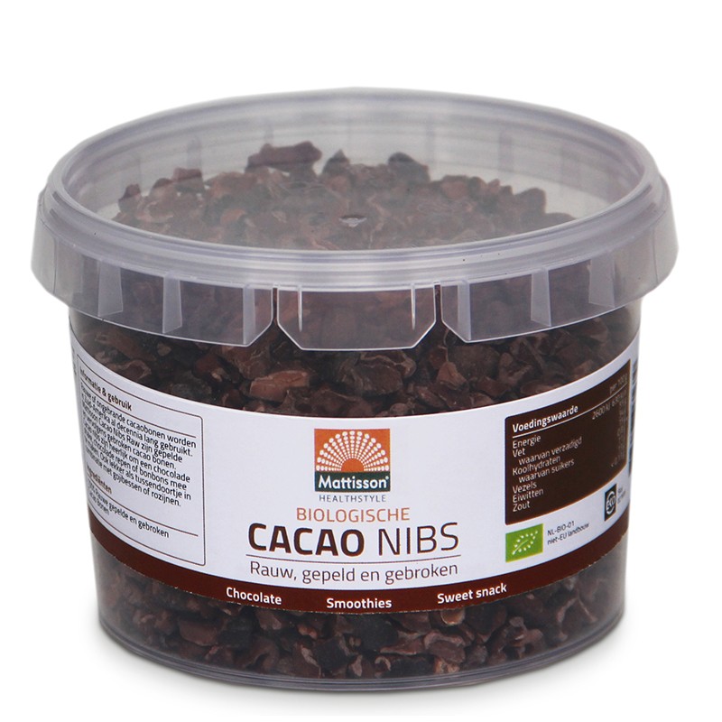 Какаовите зърна Mattisson Biologische Cacao Nibs са сурови, обелени и натрошени с максимално запазени естествени хранителни вещества. 100% органични, с произход  Перу. Вкусна суперхрана. Съдържат фибри, протеини и здравословни мазнини. С енергийна стойност от 2600 kJ / 630 kcal на 100 грама, те могат да осигурят чудесен енергиен тласък.
