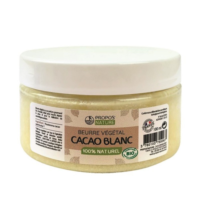 Този продукт е произведен чрез механично пресоване и филтриране на суровина от какаови семена Theobroma от Доминиканска република. Има твърда и плътна консистенция, без добавки и изкуствени подобрители. Подходящо е за лечебни смеси, като основа за масаж и като мастна база на емулсия. Тъй като произхожда от биологично земеделие и контролиран производствен процес, това сурово какаово масло действа добре на всички видове кожа. Използва се за грижа за тялото, лицето и косата.