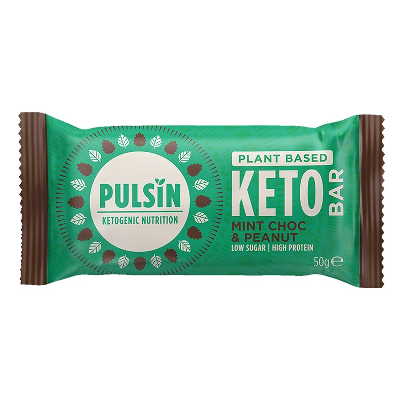 „Kето бар с мента и фъстъци“ на Pulsin съдържа протеин на растителна основа и е перфектен за поддържане на енергията през деня