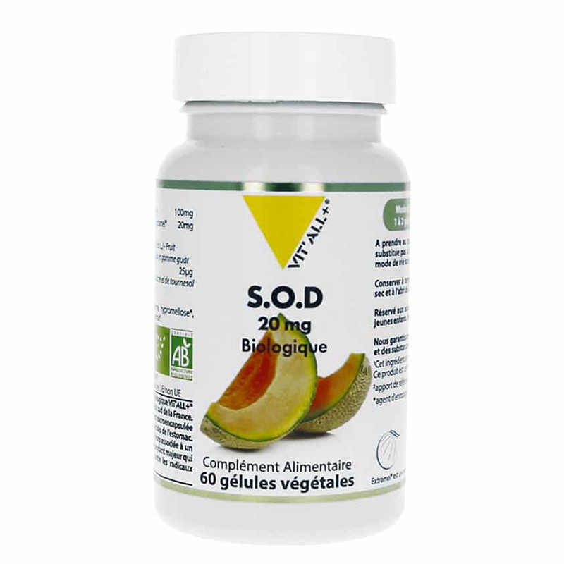 S.O.D (Super Oxide Dismutase) на френската компания VIT’ALL+® преодолява този „логистичен“ проблем с помощта на силно биоактивен ензим супер оксид дисмутаза (280IU), който се получава от био сок от пъпеш от Южна Франция. Използваният сорт пъпеш Cantaloupe (Cucumis melo L. var. cantalupensis), известен със своята отчетлива мрежеста кора, e избран именно заради високата си концентрация на активни съставки.