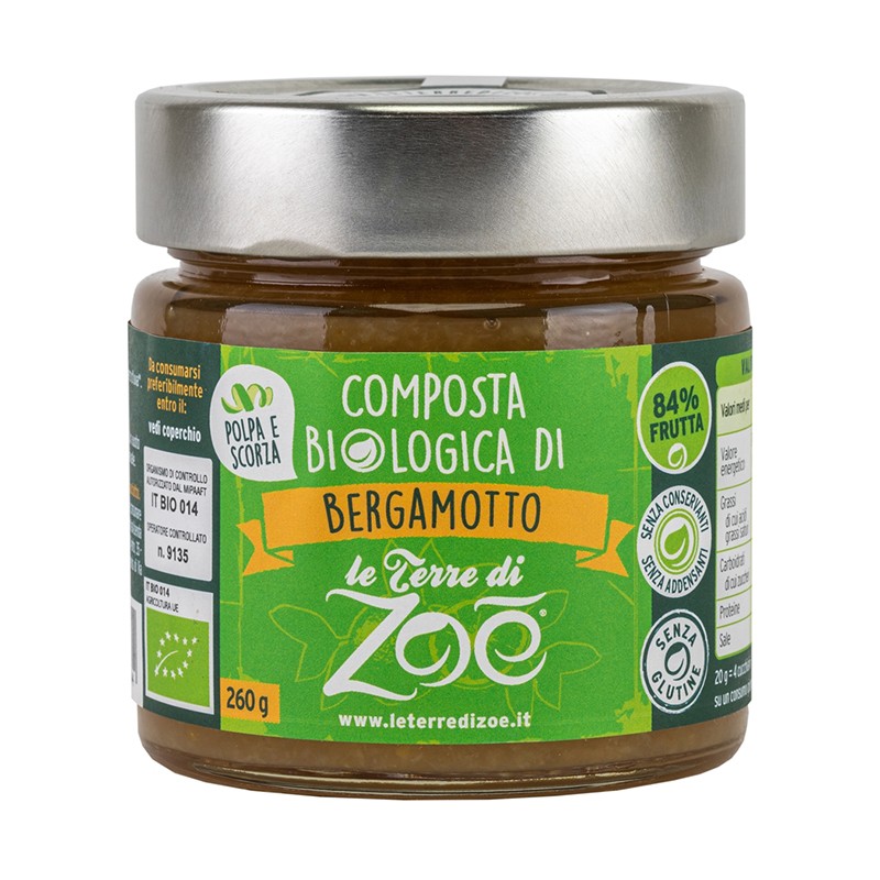 Конфитюрът от бергамот „Le terre di zoe“ се произвежда в Калабрия с органично отгледани бергамоти. 100% занаятчийска плодова консерва, приготвена на ниска температура с добавена гроздова захар и подправки. Без рафинирани захари, консерванти или оцветители.