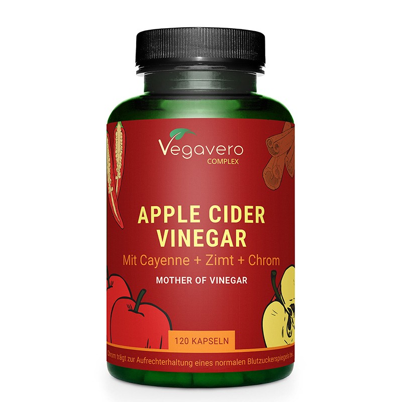 Този комплекс предлага силно концентриран и оптимално координиран продукт с 1500 mg ябълков оцет, допълнен от 150 mg лют червен пипер, 150 mg екстракт от джинджифил, 150 mg екстракт от канела и 100 µg хром от хромов пиколинат в дневна доза. Ябълковият оцет на прах се получава от фермента (майката) на естествено мътен оцет и доставя различни витамини, минерали и „добри“ бактерии. Хромът и канелата са традиционно използвани за понижаване на нивата на кръвната захар, повишени поради генетични особености, хормони, стрес и липса на физическа активност. Препоръчителната употреба е по една капсула 3 пъти на ден с основното хранене. Изцяло растителните капсули, без ГМО и синтетични добавки, са подходящи за вегани.