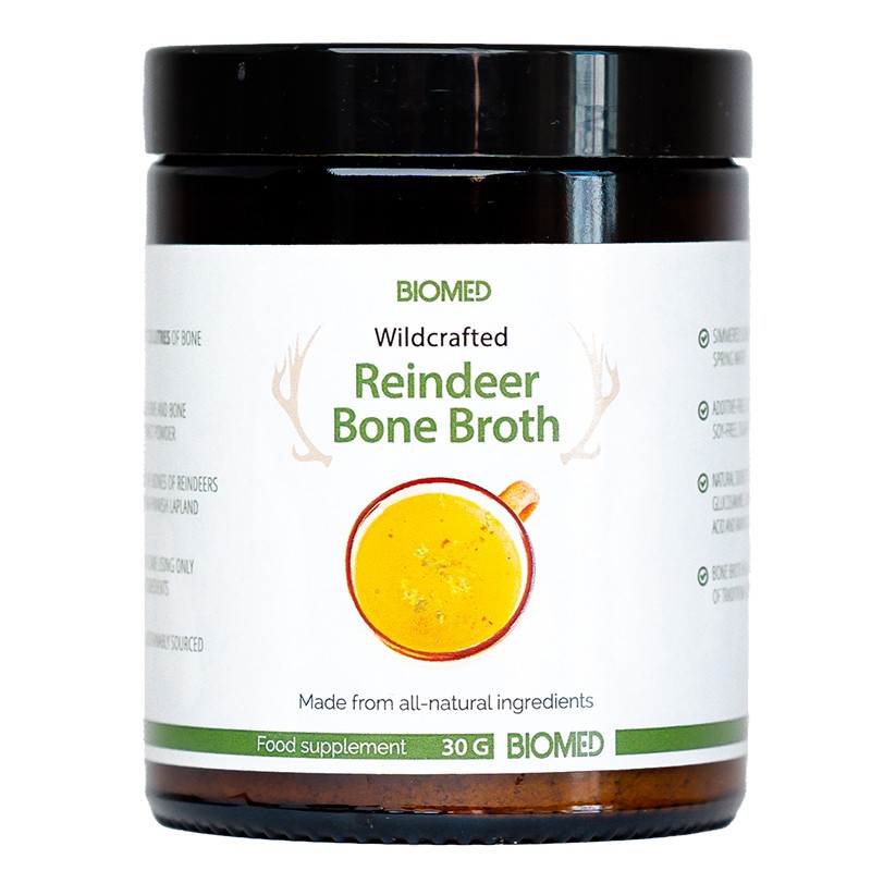 100% натурален бульон на прах, получен от костите на полудиви, пасищни елени от Лапландия и приготвен в чиста изворна вода. Естествен източник на колаген, глюкозамин, хондроитин, хиалуронова киселина и аминокиселини. Лиофилизиран посредством специалната технология NatureDry, която запазва всичките му полезни съставки. Удостоен с наградата за здравен продукт на годината (за 2020) във Финландия. Опаковката е достатъчна за приготвяне на до 7.5 л. бульон.