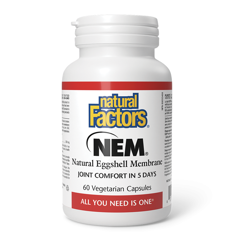 Клинично доказано е, че NEM® насърчава комфорта и гъвкавостта на ставите само след 7 до 10 дни употреба. Съставен от естествено срещащи се гликозаминогликани, включително хондроитин и хиалуронова киселина, NEM® съдържа колаген и други полезни протеини. Помага за поддържане на здрави стави, срещу болка, скованост и разрушаване на хрущяла. NEM® се произвежда по устойчив начин от възобновяеми доставки на местни яйчени черупки от САЩ. Препоръчителната доза от 1 капсула дневно осигурява на организма 500 mg натурална яйчена мембрана с множество ползи за организма.