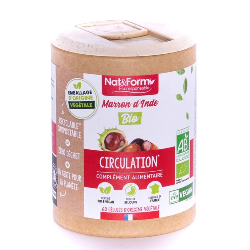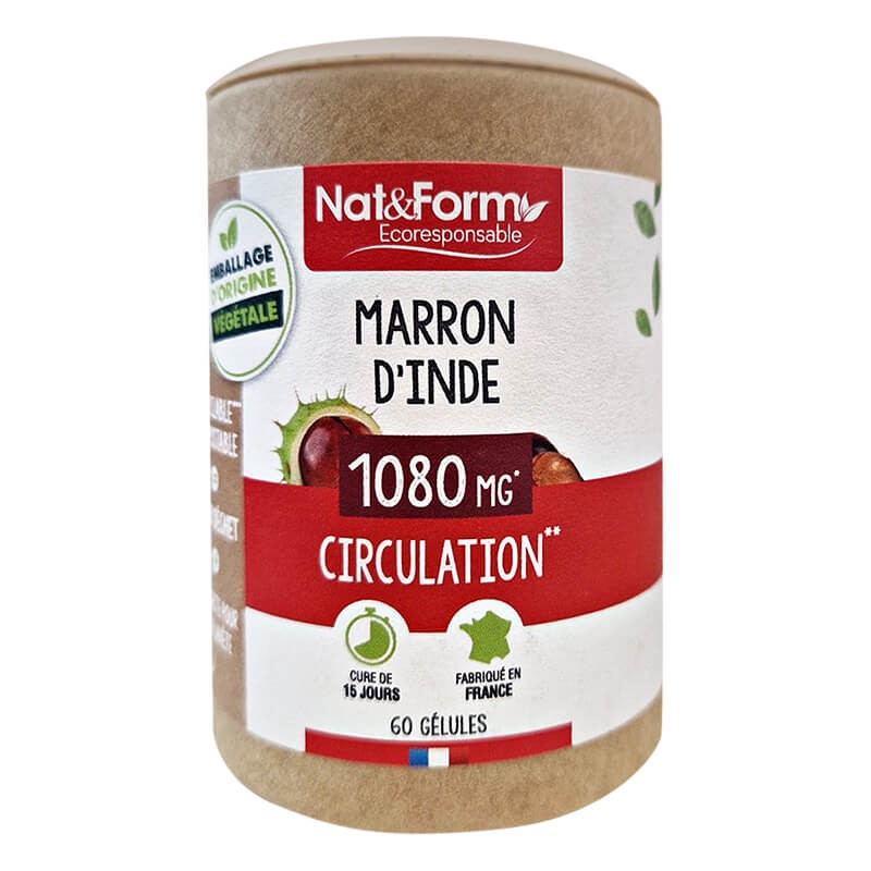 Продуктът Мarron d’Inde на Nat & Form е създаден на базата на прах от органичен конски кестен за облекчаване на симптомите на дискомфорт, свързани с проблеми на венозната циркулация. Венотоничните и противовъзпалителни свойства на конския кестен са ефективни при нарушения на кръвообращението, като помагат и в борбата с разширените вени. Конският кестен е голямо дърво, произхождащо от Балканите и Западна Азия, което расте диво в цялото Северно полукълбо. Традиционно се използва за подобряване на устойчивостта на малките кръвоносни съдове и за подобряване и тонизиране на кръвообращението. Кестенът укрепва стените на кръвоносните съдове, премахва излишната течност, тонизира кожата, подобрява метаболизма, има противовъзпалително и аналгетично действие.