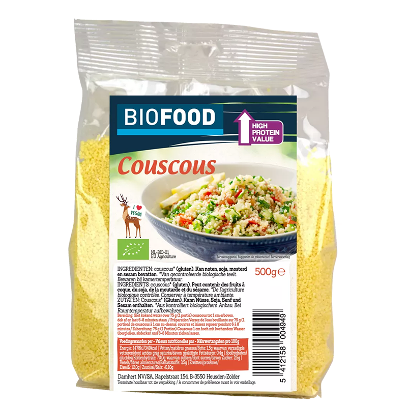 Кускус, БИО Damhert може да се сервира и като гарнитура с месен сос. Като алтернатива да се комбинира с други зърнени храни ( киноа и кафяв ориз), заедно със зеленчуци по избор.