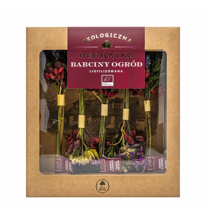 Органичният чай Бабина градина на Dary Natury е съставен от висококачествени лиофилизирани цветове, плодове и листа на билки, произхождащи от сертифицирано биологично земеделие. Билките монарда, бял равнец, мента, берберис, невен и шипка действат благоприятно на храносмилателната система, а цветовете от лавандула спомагат за по-добра релаксация. Чаят може да се пие по всяко време на деня, както горещ, така и под формата на студена освежаваща напитка .