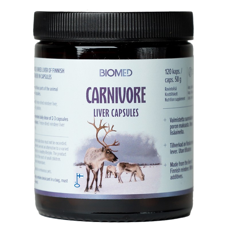Carnivore Liver – Лиофилизиран черен дроб от финландски северен елен е хранителна добавка под формата на капсули, добита от внимателно изсушен чрез замразяване черен дроб от северен елен